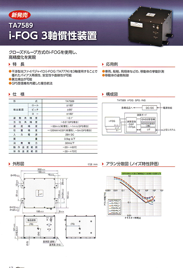 干渉型光ファイバジャイロ(i-FOG : TA777N4 )を3軸使用することで優れたバイアス再現性、安定性や直線性が可能。
